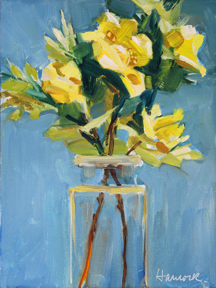 When life gives you lemons, first paint a light-drenched high-key still life painting of the lemons in a clear glass bowl; then make some lemonade to celebrate your efforts. I like the warm and cool colors of the lemons in light and shade and the lavenderish grays in the bowl and on the tabletop.