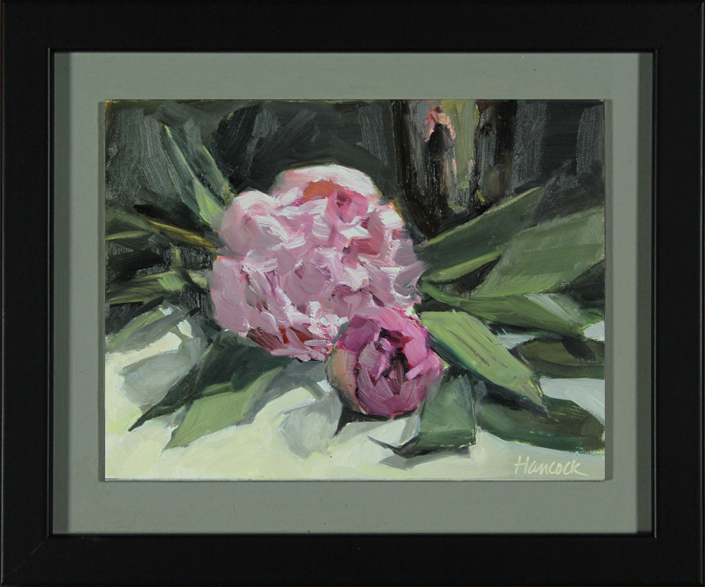 A 6 x 8 original oil still life painting of two pink peonies lying on the