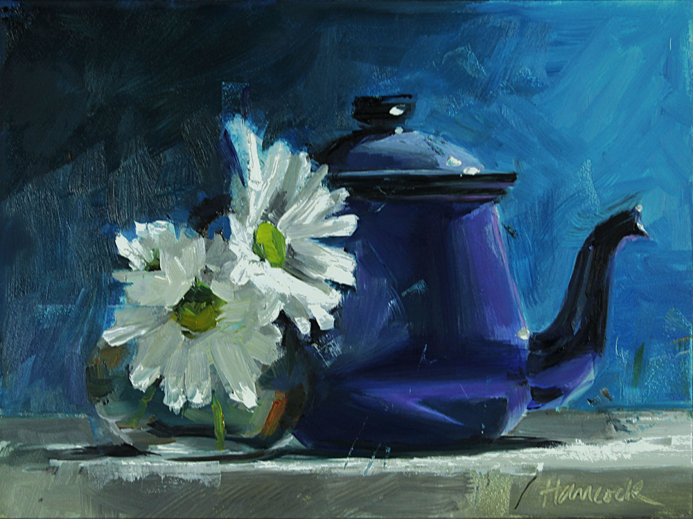 The favorite blue enameled teapot makes another appearance, this time with two white chrysanthemums. I like the scant amount of white in the white flowers - it contrasts nicely against the darks of the teapot. The simplified color scheme is very harmonious. I like the lost and found edges and the simplified painting in the flowers. This will be at the Vashon Island Art Tour this weekend May 13 & 14. Stop # 23 in Dockton. Be sure to visit! Last weekend!